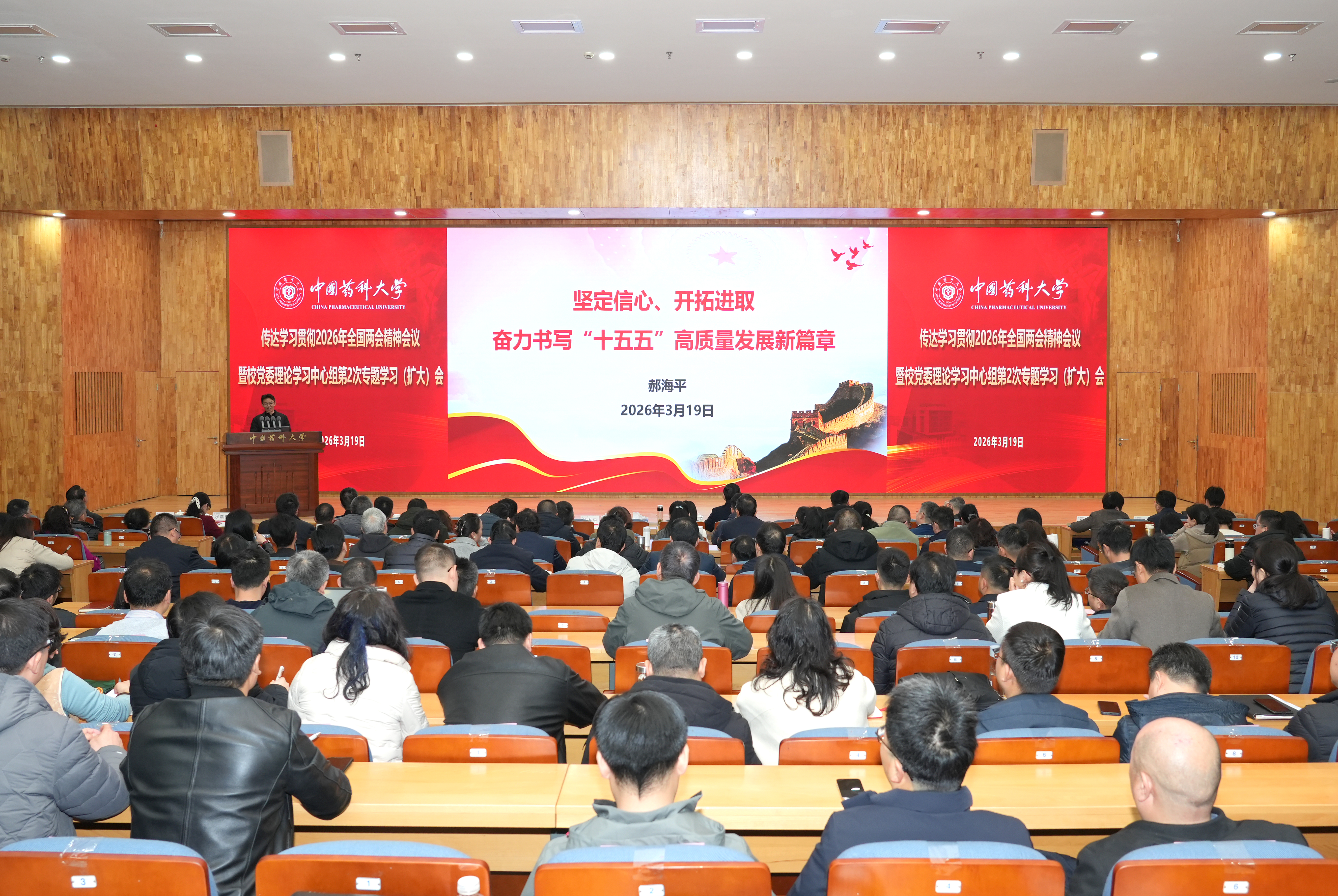 会上,全国政协委员、校长郝海平以《坚定信心、开拓进取,奋力书写“十五五”高质量发展新篇章》为题作专题辅导报告。他以全国两会“五大关键词”为切入点,系统介绍了2026年政府工作报告的主要内容,重点传达了习近平总书记在参加江苏代表团审议时的重要讲话精神以及习近平总书记在政协联组会上的重要讲话精神。与此同时,他简要介绍了个人履职情况,并结合学校实际和自身学习体会,深入阐明了正确政绩观的核心要义,畅谈了未来学校改革发展思路。他强调,政府工作报告中首次将生物医药列为“新兴支柱产业”,全校上下要锚定教育的政治属性、人民属性、战略属性,前瞻布局生物医药制造和人工智能等交叉学科的未来产业发展方向,加速推动“人工智能+医药”融合发展这一时代命题在学科建设、人才培养、科研攻关等方面从技术赋能迈向范式变革,持续深化有组织科研,强化跨学科协同攻关,力争在疾病机制与靶点发现、药物开发与优化、构建药物知识图谱等领域取得标志性突破,为打造原始创新策源地和人才培养高地贡献智慧和力量。